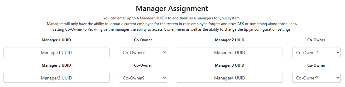 ("Manage" Button will let them edit Profit Sharing, Manager UUID's, Co-Owner status, Group use option, Pay buttons, & Bot IM settings)